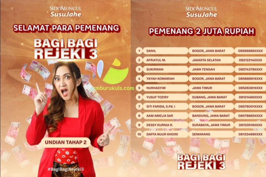 Pemenang undian Sidomuncul Susu Jahe-Sobat pemburu kuis, promosi Sido Jahe bagi-bagi rejeki uang tunai berlangsung sampai akhir tahun 2023.