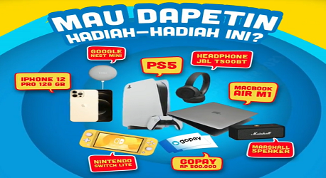 - Hadiah Bulanan: Saldo Gopay @ Rp 500.000, JBL Headphone Tune 500BT, Nintendo Switch lite, Google Nest Mini, Marshall Emberton Speaker